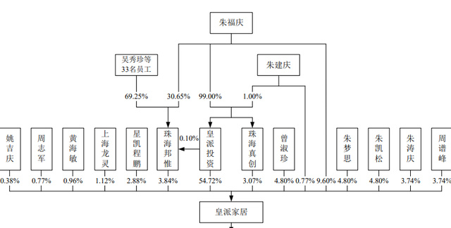 朱福庆之妻曾淑珍直接控制了皇派家居4.8%的股份,朱福庆之子朱凯松直接控制了皇派家居4.8%的股份,朱福庆弟弟朱建庆直接控制了皇派家居0.77%的股份,朱福庆之表弟周志军直接控制了皇派家居0.77%的股份。粗略合计,朱福庆及其家族共控制了皇派家居90%以上的股份表决权。