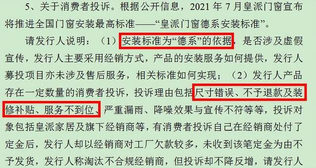 证监会提到,2021年7月皇派门窗宣布将推进全国门窗安装最高标准——“皇派门窗德系安装标准”。对该“德系”标准,证监会问及“安装标准为‘德系’的依据,是否涉及虚假宣传,发行人主要采用经销方式,产品的安装服务如何提供,发行人募投项目亦未涉及售后服务,相关标准如何实现”等问题。