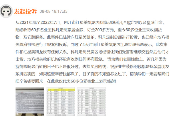 证监会在问询中也提到,发行人产品存在一定数量的消费者投诉,投诉理由包括尺寸错误、不予退款及装修补贴、服务不到位、严重漏雨、降噪效果与宣传不符等,投诉对象包括皇派家居及旗下经销商等,有消费者投诉自己在经销商处付了定金后,发行人却以经销商对工厂欠款较多,未收到该笔定金为由不予发货,发行人称淘汰不合规经销商,但投诉却不降反增。