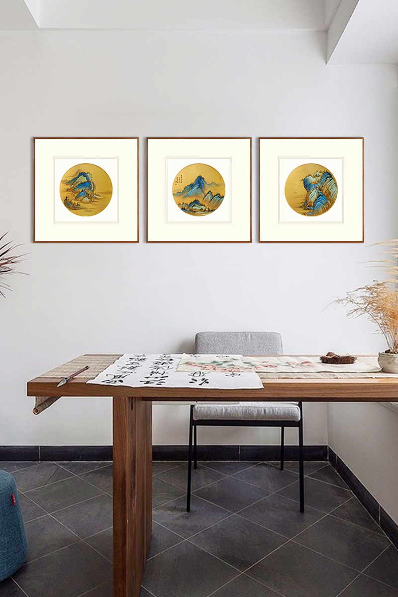 林棋祥巧妙地手绘仿作《千里江山图》三联画,别具匠心地采用三联画构图,展现了纵横捭阖千秋的山水佳话,与延绵不绝的锦绣河山共舞。悬挂于家中,千里之景、富丽之紫为居室添彩,寓意着华贵吉祥,同时昭示着主人深邃的胸怀。邀集宾朋共赏此佳作,品一盏清茶,寻觅一段盛世岁月,实乃人生一大乐事。千古名画虽受国门之限,却可藉此仿作流连于家,岂不是一种别样的幸福?