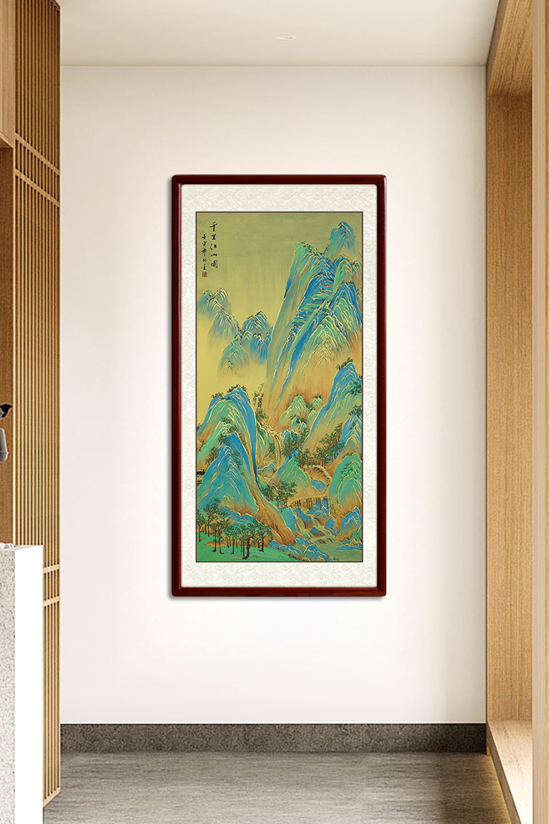 在玄关处的画作,羽墨巧妙地运用了《千里江山图》中的青绿色调,以柔和的山水画法勾勒出一幅宏伟壮丽的景象。画中的远山巍峨,近水如烟,营造出一种神秘而宁静的氛围。这幅画作在玄关的位置,仿佛邀请着每位进门的宾客走进这幅画卷般的世界,感受古人的山水情怀与艺术才情。