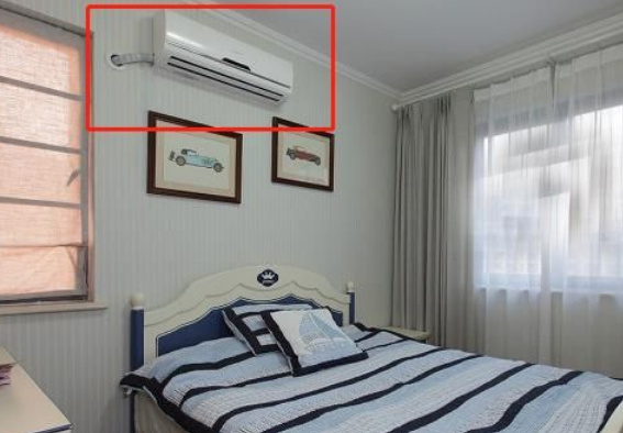 床位处于空调下方;如果床位在空调上方,那因为上面出来的冷气直射到头部、肩部,久而久之就会造成睡眠不好。所以这个空调的位置要布置好