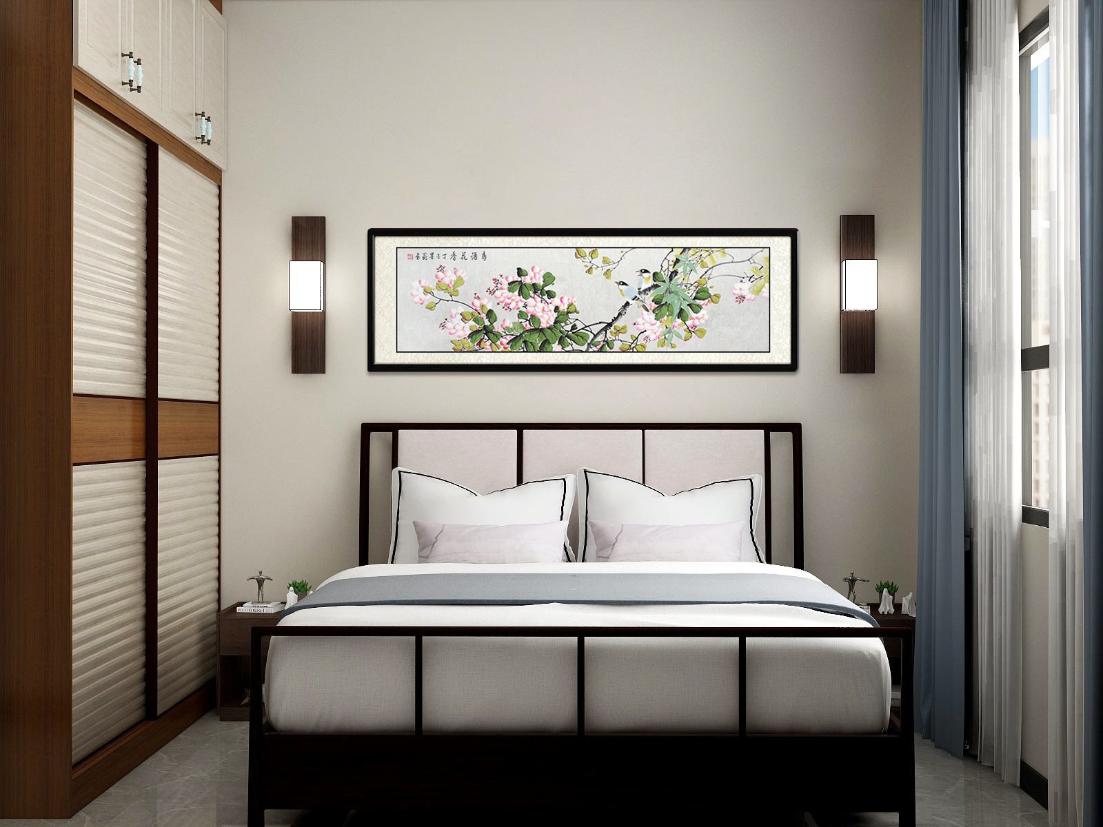 卧室挂画:卧室是个人休息的私密空间,挂画应以营造宁静舒适的氛围为主。一幅精美的花鸟画或山水画,以柔和的色彩与简约的线条,为卧室带来一份恬静之美。