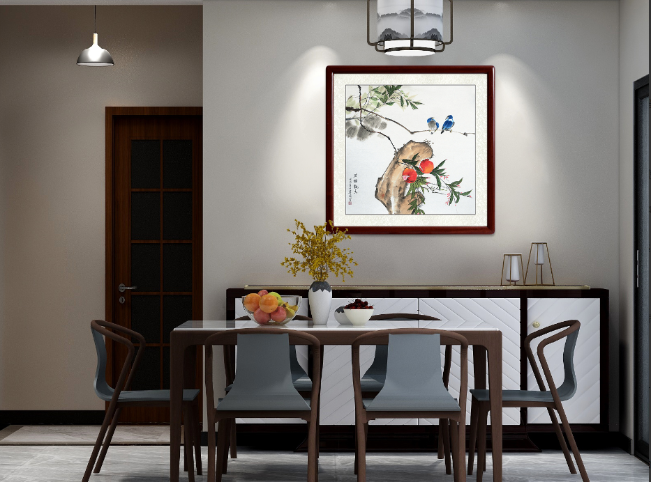 餐厅挂画:餐厅是家庭成员共享美食的地方,挂画应注重营造温馨愉悦的氛围。可选择一幅以水果或静物为主题的国画,以其丰富的色彩和生动的形象,为餐厅增添一份生气与活力。