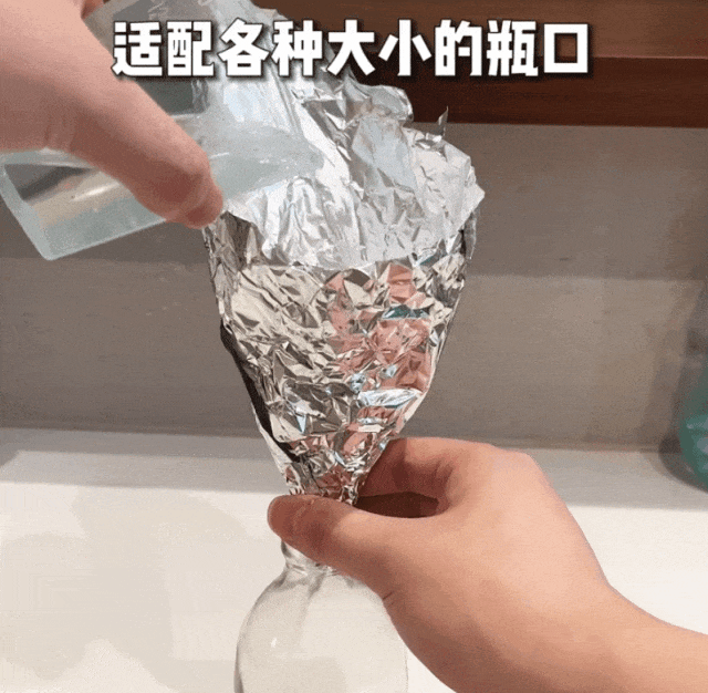 所有我们就可以把锡纸捏成漏斗的形状,然后放在瓶口,就能轻松实现液体分装了。而且它适配任何瓶口,自己随便拿捏,怎么倒都不会漏,可以放心用。