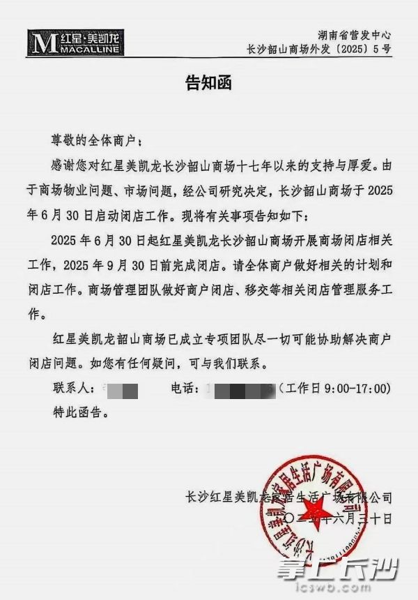 “2025年6月30日起红星美凯龙长沙韶山商场开展商场闭店相关工作,2025年9月30日前完成闭店。”在长沙红星美凯龙家居生活广场有限公司发布的一份致全体商户的告知函中,记者看到其给出了明确的闭店时间表,这座运营近20年的“长沙首店”即将画上句点。