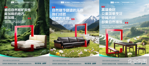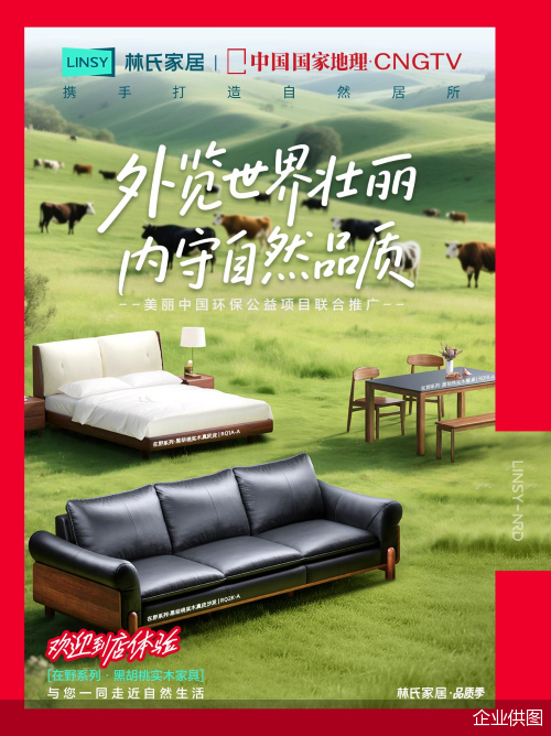 在与中国国家地理·CNGTV合作的系列传播海报中,黑胡桃木的天然纹理与山川地貌巧妙融合,林氏家居将材质优势转化为可感知的生活意境,海报文案反复强调“自然”二字,并在微博等社交平台引发“实木美学”话题讨论,完成了从产品功能到情感价值的认知跃迁。