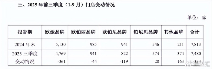 同时,家居“一哥”欧派家居的门店数量也出现收缩。截至2025年三季度末,其门店由2024年年末的7813家降至7480家,净关闭门店数量333家。